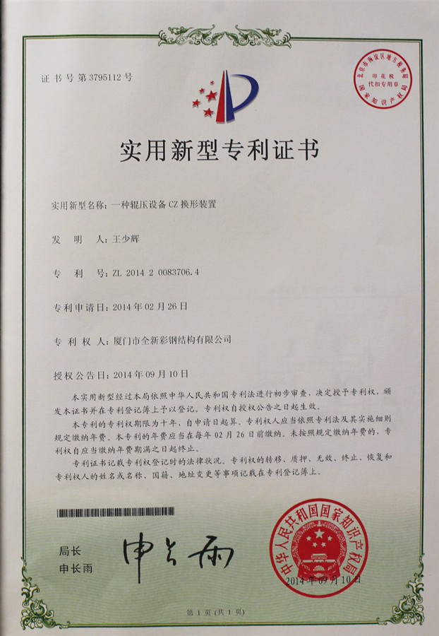 Patent Certificate of CZ Interchange Roll Forming Machine