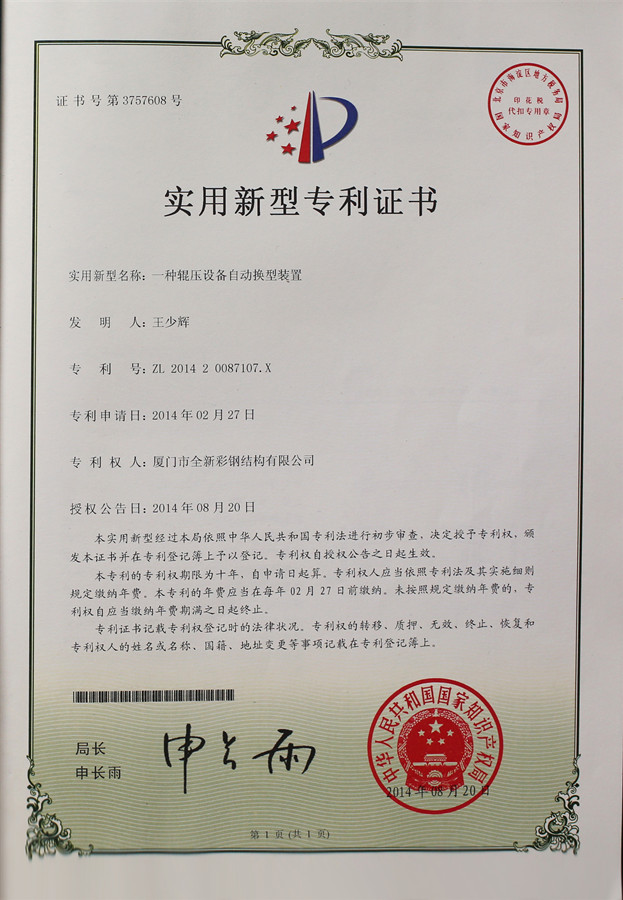 Patent Certificate of Interchanging Roll Forming Machine