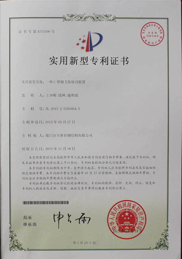 Patent Certificate of Saw Cutter